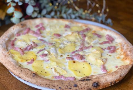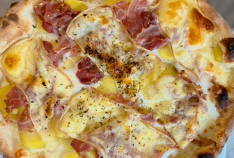 Base crème de chicon maison ,mozzarella, jambon , olives , fondue de fromages, oignons rouges, éclats de noisettes, corne farcie à la saucisse italienne