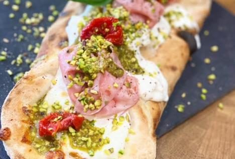 Base crème de chicon maison ,mozzarella, jambon , olives , fondue de fromages, oignons rouges, éclats de noisettes, corne farcie à la saucisse italienne