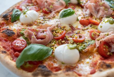 Tomates San Marzano, mozzarella fior di latte, tomates cerises, Jambon San Daniele, pesto, pistaches, bocconcini di bufala