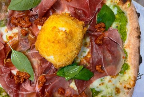 Crème de petits pois, mozzarella fior di latte, pesto rouge, jambon San Daniele et burrata fritta.