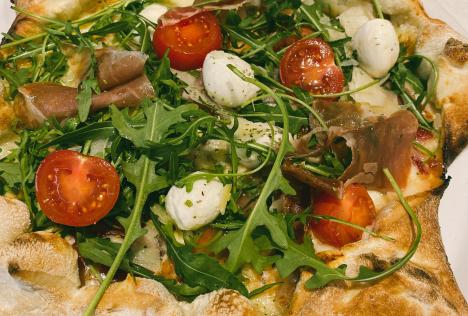 Tomates San Marzano, mozzarella, jambon San Daniele, roquette, parmesan, bocconcini di Bufala, croutes fourrées à la mozzarella